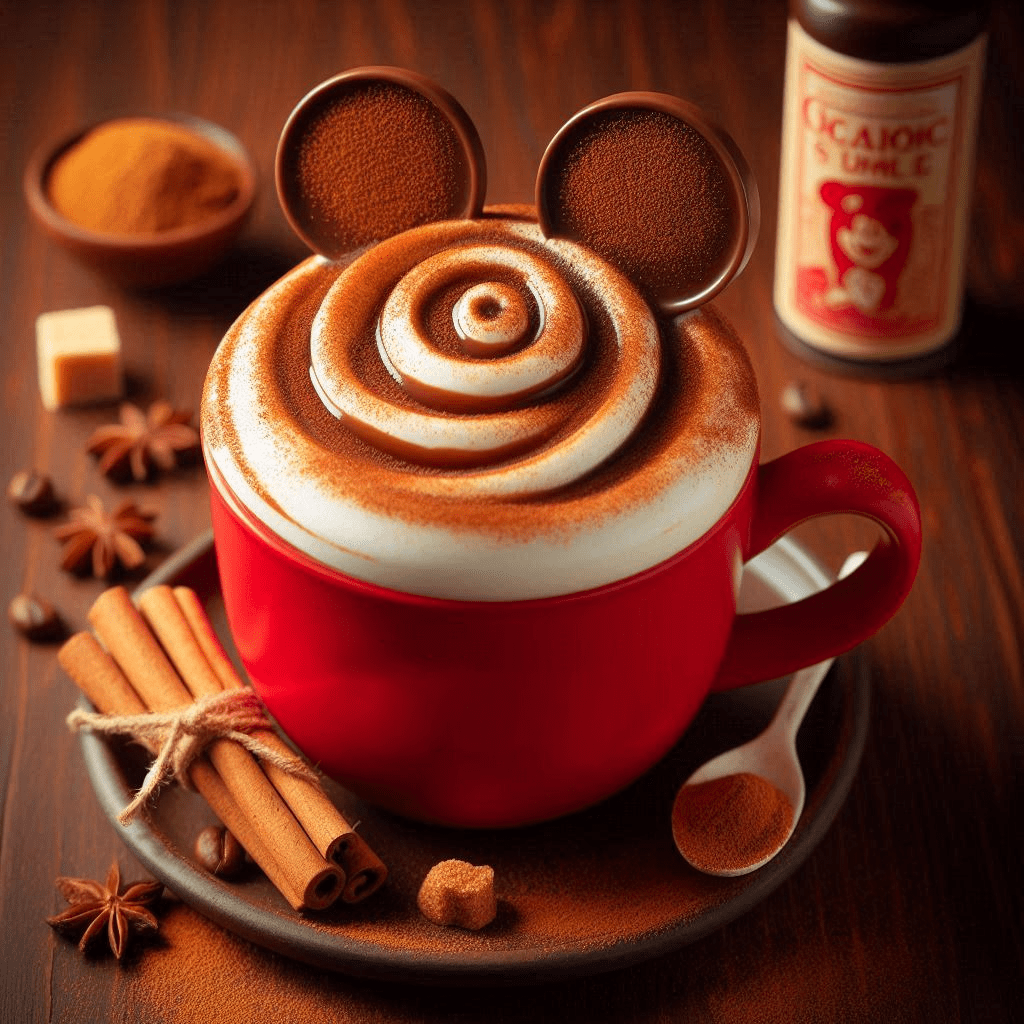 Serve in a classic red mug with Mickey’s silhouette, and top with frothed milk, a sprinkle of cinnamon, and a Mickey-shaped chocolate topper.