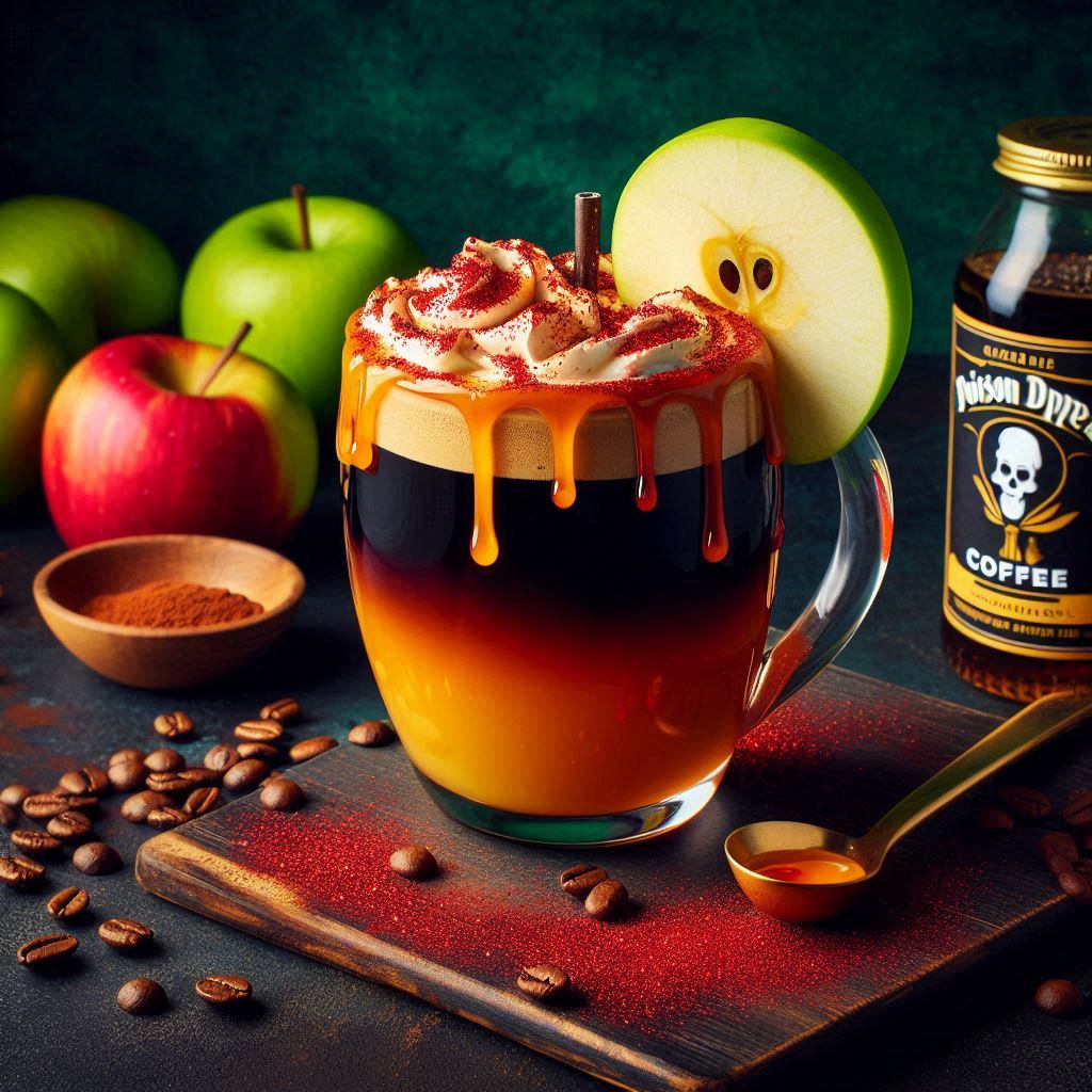 Beware! This Fall coffee mocktail might look too tempting to resist. The Poison Apple Brew is a rich Fall coffee drink with a blend of caramel and apple flavors. Serve it in an apple-shaped glass or with a poison apple drink topper for that extra fairytale vibe. A drizzle of caramel and a sprinkle of red edible glitter add the final, sinister touch.