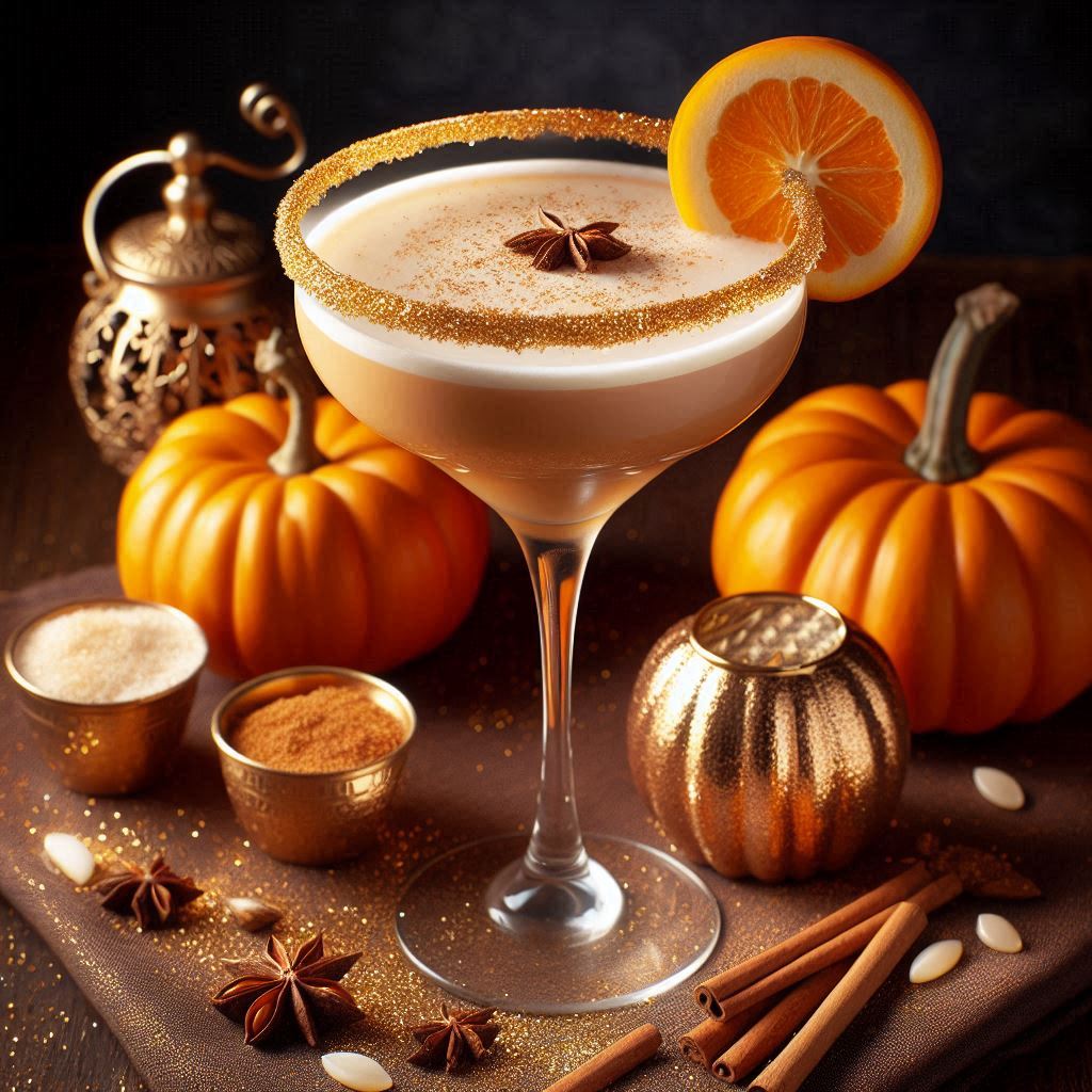 Instructions: Rim a martini glass with crushed graham crackers mixed with cinnamon sugar and sprinkle with edible gold glitter. Shake the vodka, liqueurs, and cinnamon over ice, then strain into the prepared glass. Garnish with a caramel-drizzled pumpkin candy for an extra touch of sweetness.