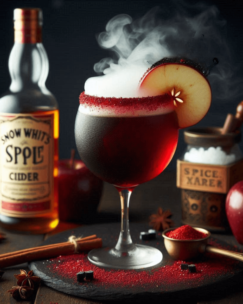 Instructions: Rim a glass with red sugar and a sprinkle of black edible glitter. In a shaker, combine the apple brandy, spiced rum, cider, and allspice. Add a small dry ice cube to the glass for a smoky effect (optional but magical!). Pour the shaken mixture into the glass and garnish with an apple slice for a darkly enchanting sip.