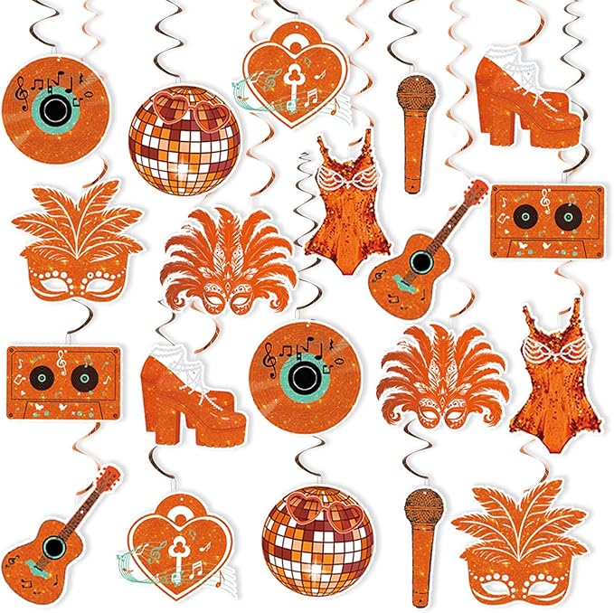 GLAMOROUS SHOWGIRL DESIGN: Step into the spotlight with our In My Showgirl Era hanging swirl decorations! Each showgirl party decorations features sparkling music notes, elegant crowns, and confident orange showgirl silhouettes, perfectly expressing the bold and dazzling vibe of Birthday Girl celebration.